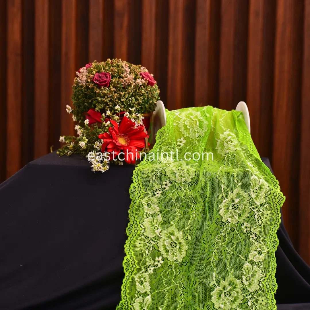This vibrant green galloon lace showcases delicate floral patterns on a sheer mesh fabric, enhanced by scalloped edges that create a beautiful finish. The lace combines a soft texture with stretchability, thanks to its nylon and spandex blend, offering both comfort and versatility. The striking green hue makes it ideal for lingerie, evening wear, decorative accents, and crafts. Its wide width ensures ample coverage for garments and design projects, adding a fresh, eye-catching look to any creation.