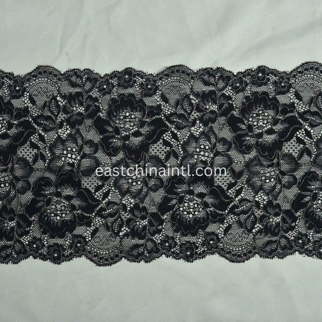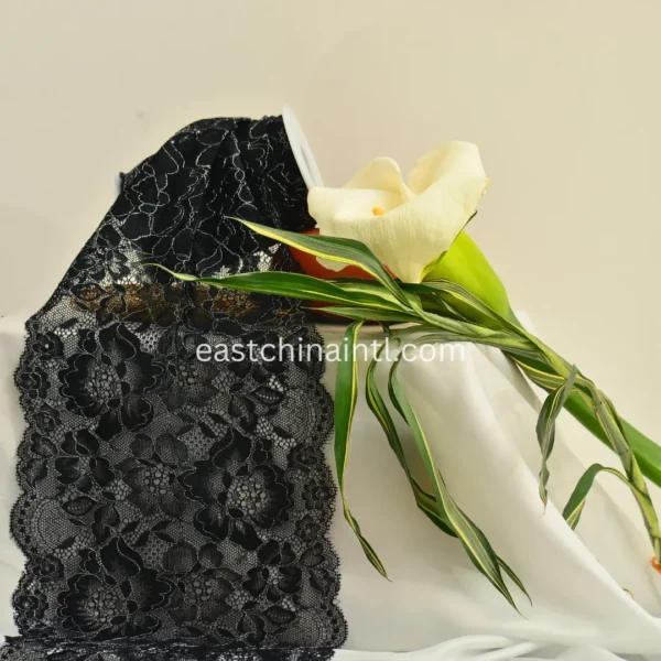 This black galloon lace features intricate floral motifs, blending a timeless aesthetic with modern elegance. Its scalloped edges add a delicate finishing touch, making it perfect for use in garments, lingerie, bridal wear, and formal accessories. Crafted from a high-quality polyester and nylon blend, the lace offers durability, flexibility, and a soft feel against the skin. Its wide width and exquisite detailing provide versatile applications for both fashion and home decor projects, delivering sophistication to any design.